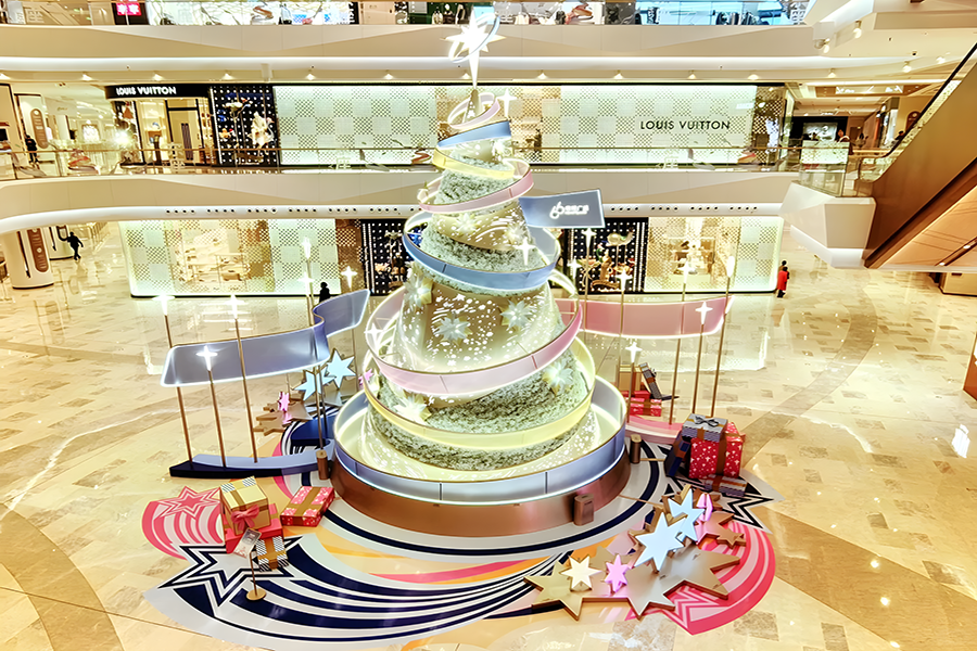 2024年,武漢恒隆廣場的圣誕樹裝置再次升級,由發(fā)光彩帶、雪花和星星環(huán)繞而成,整個裝置絢麗而夢幻,仿佛置身于童話世界之中。